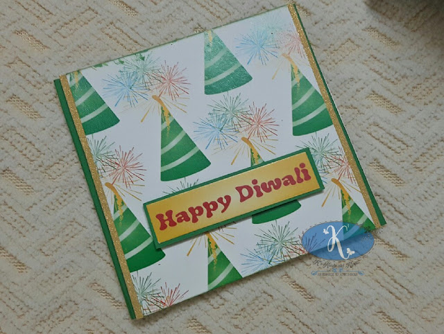 For the 4th card, I used the Sparkling Diwali paper pack and chose a fireworks one. It is a square card with a simple layer of gold on the sides on base green cardstock. The sentiment is also from the same pack, matted onto green cardstock.